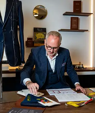 Tijekom 90-minutnog sastanka precizno uzimamo mjere, biramo kroj, tkanine i personalizirane detalje kako bismo stvorili odijelo koje odražava vaš stil.